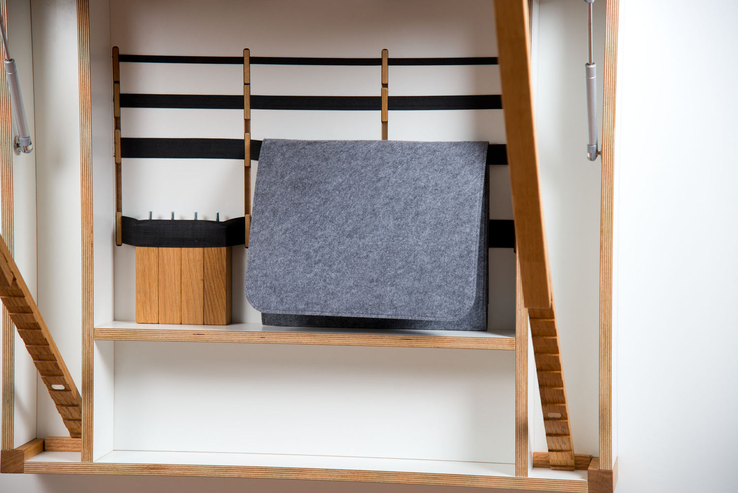 ausbauen und mittels seiner – in der Länge variieren - Beine wird seine Klappe als Schreibtischplatte fixiert.