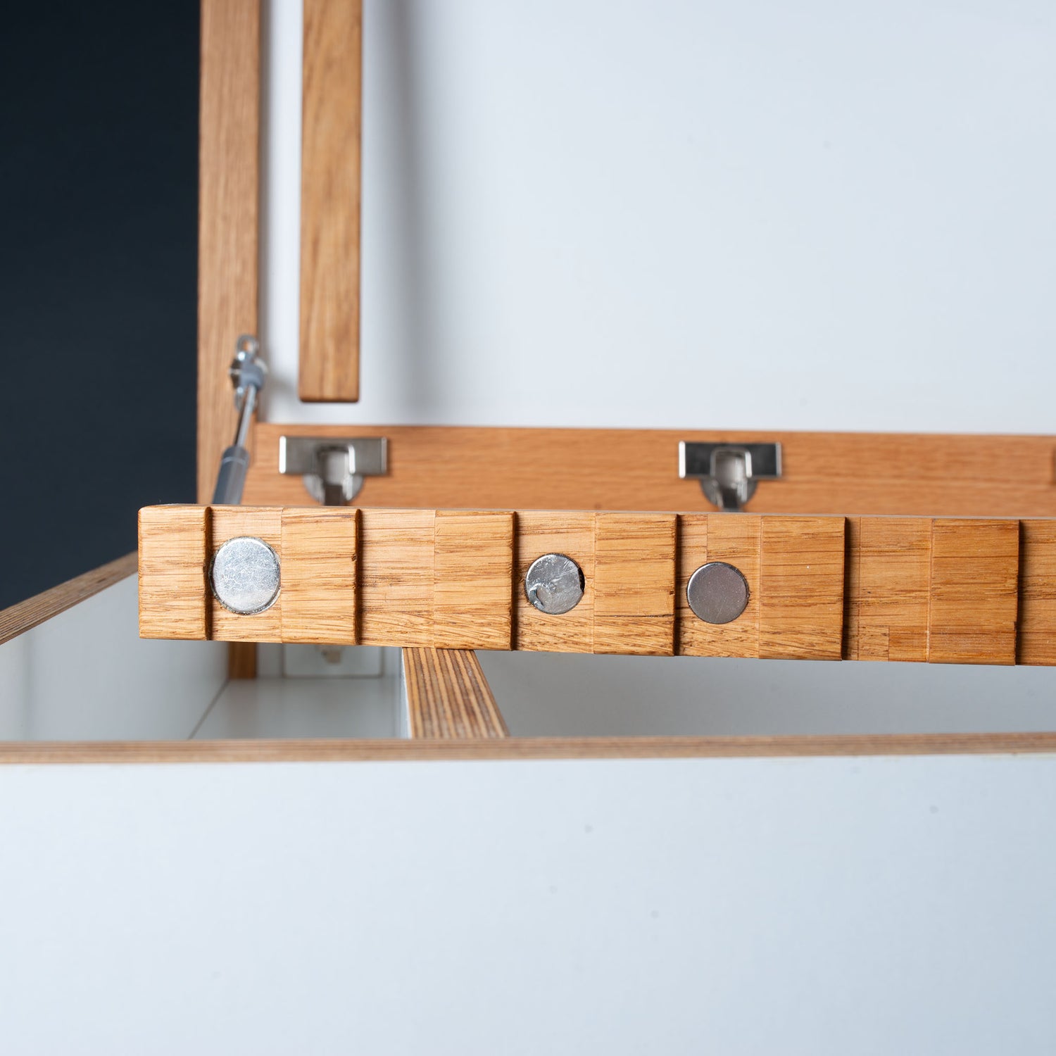 Im Inneren des Korpus lassen sich die Beine magnetisch befestigen. Gummibänder, die mittels Keilen in Länge und Position variabel sind, halten Beine oder persönliches Material. Durch Bohrungen im Korpus lassen sich Daten- oder Stromkabel ziehen.